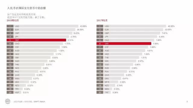 国际支付方面,相比2017年1月,人民币在2017年2月保持了国际支付第六大最活跃货币(按金额)的地位,份额为1.84%。人民币支付金额比2017年1月增加4.10%,而所有支付货币的结算总额减少5.21%。