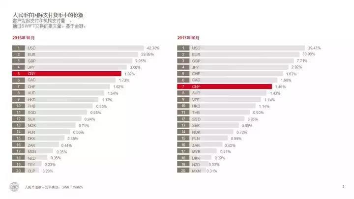 在2017年10月,人民币由第六位下跌成为国际支付第七大 货币(按金额)的地位,份额为1.46%。本月的下跌很可能受到季节性及十月黄金周 的影响。瑞士法朗取缔加拿大元成为国际支付第五大最活跃货币,份额为1.63%,后者份额为 1.60%。总体而言,人民币支付金额相比2017年9月下跌19.10%,而所有支付货币的结算总额下跌3.02%。