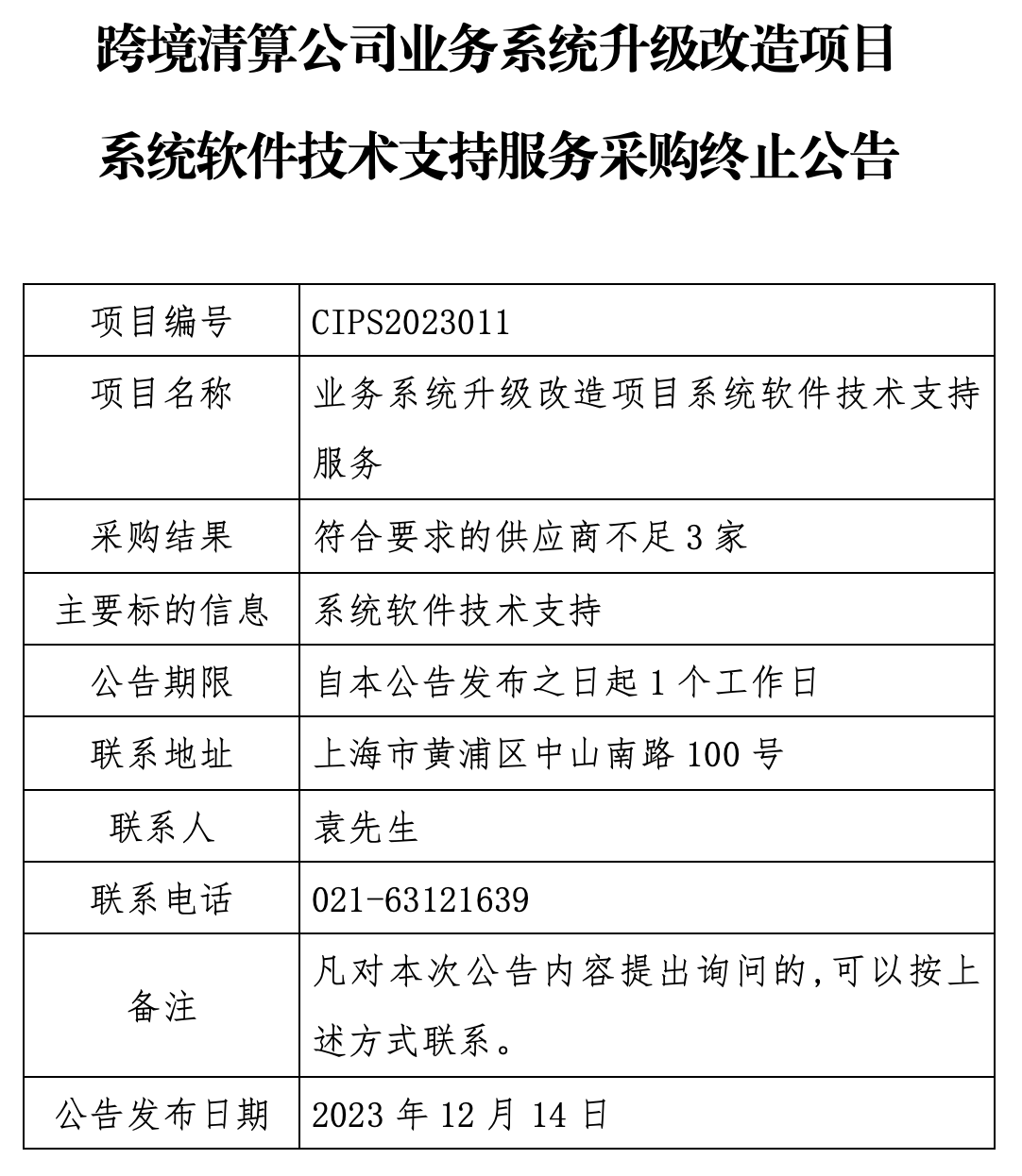跨境清算公司业务系统升级改造项目系统软件技术支持服务采购终止公告